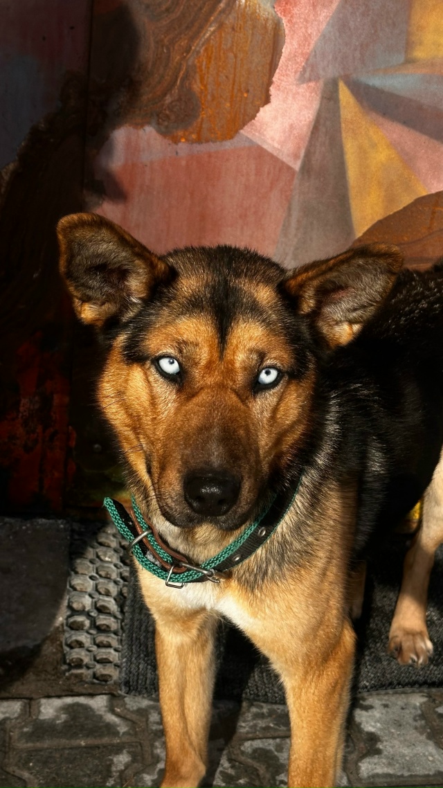 Где-то очень далеко видимо присутствует родственная связь с хаски, но оооочень далеко. Из основных признаков - необычный цвет глаз и временами чрезмерная "разговорчивость")